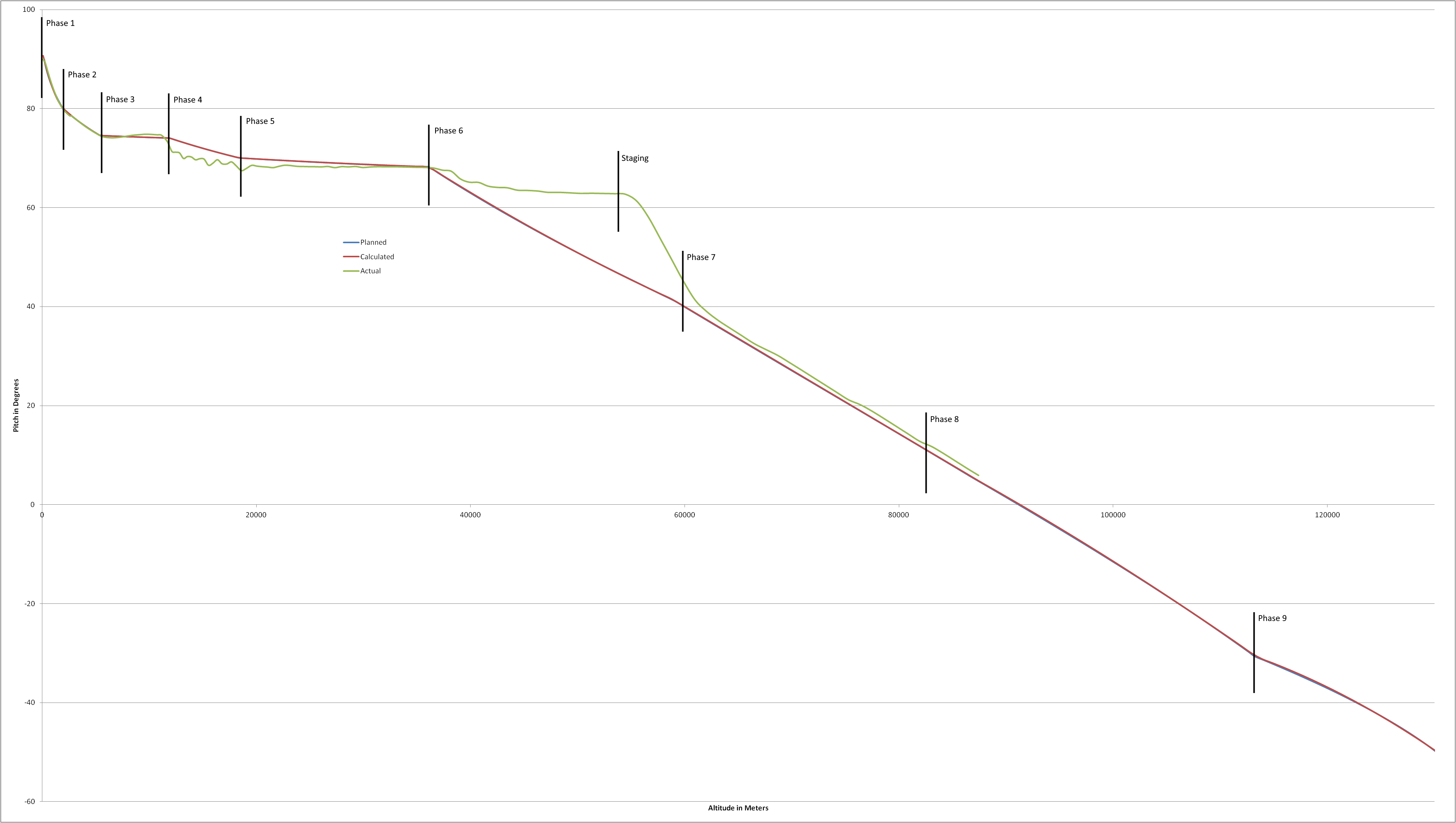 This was the first orbital mission to use an optimized trajectory in LVD, similar to what was done for a sub-orbital Ascension Mk1 flight earlier this year. This means that instead of coming up with a possible guidance profile we know the flight computer can fly and seeing how close that brings us to our intended trajectory, we had LVD work up an ascent profile targeting our intended orbit, then had to come up with a guidance profile to match it. In the past these guidance profiles were based on a singular quadratic fit function that would compute the proper pitch angle for the entire ascent. With phasing we are breaking up the pitch profile to use multiple quadratic fit functions over the course of the ascent. This was the first time we used so many, breaking the ascent down into 9 phases.