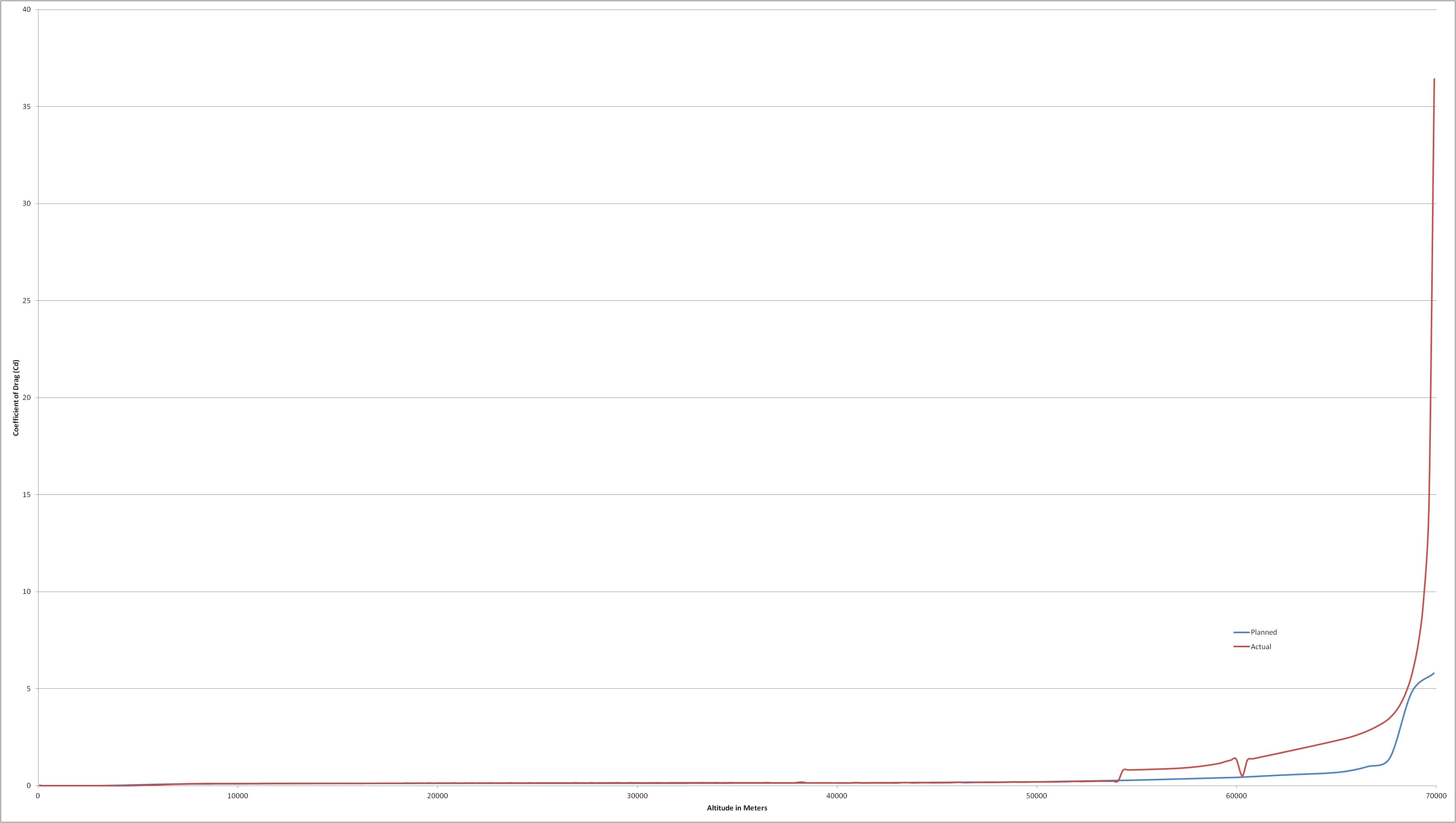 This discrepancy is more of our own doing, since although we used data from the first Ascension Mk1 mission it was not very fine grained and was also averaged over a wide range of altitudes. In the months since we have improved our ability to capture this parameter while in flight and you can plainly see where the first stage is let go at 54km and the fairings are detached at 60km. Considering this is the regime where the drag coefficient is highest the large discrepancy likely had a significant impact on our planning.